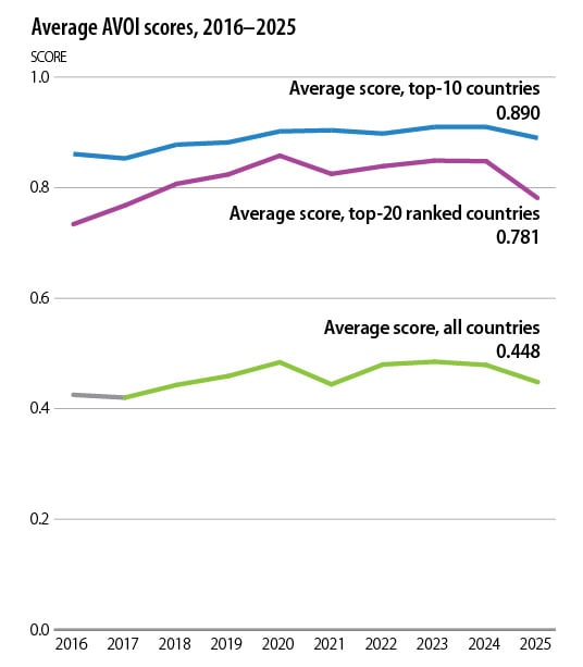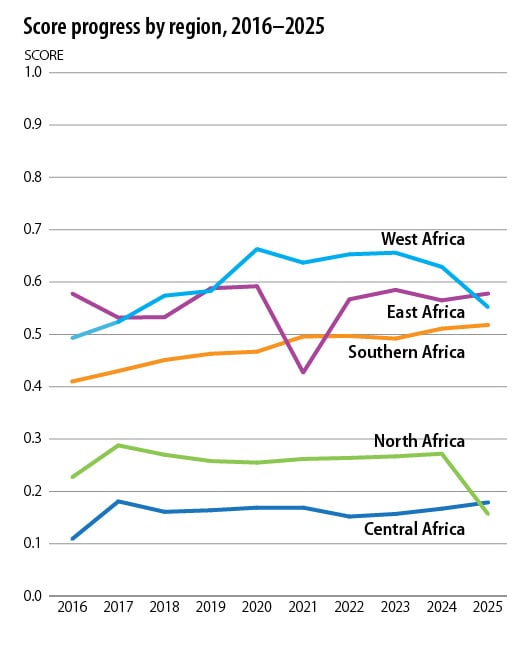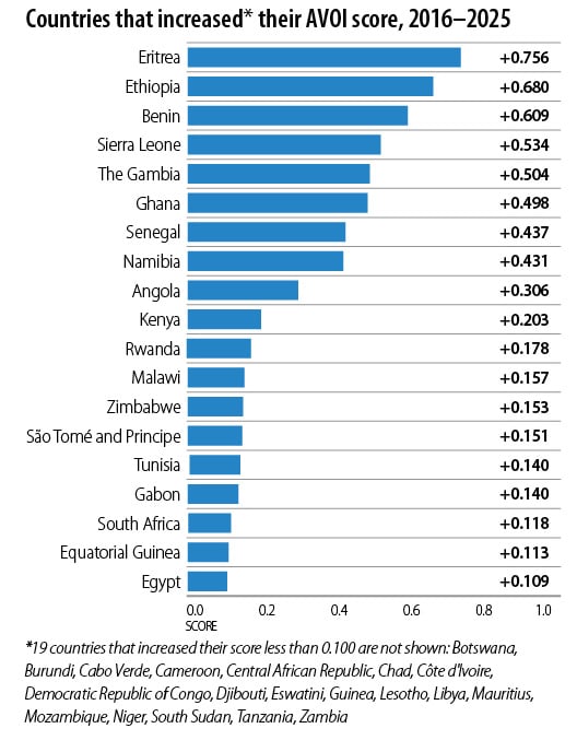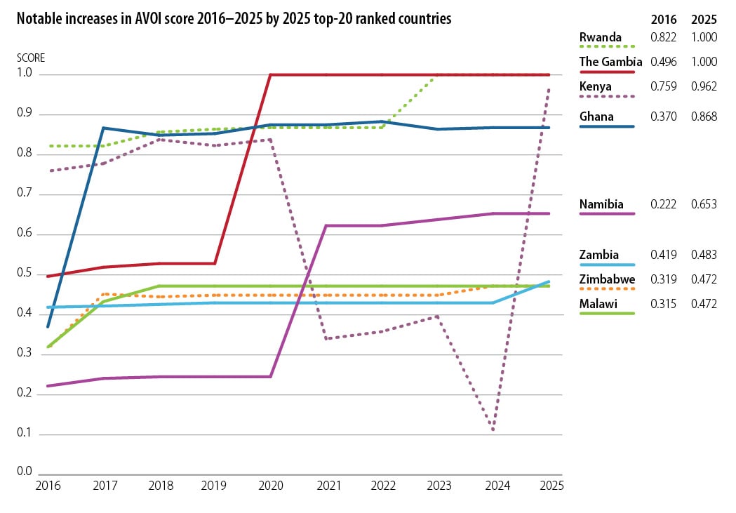 Several other countries have also made significant progress, even if sometimes starting from a relatively low base. Eritrea and Ethiopia are two of the most improved countries when considering the difference in overall score in 2025 versus 2016, in terms of the AVOI’s assessment methodology and scoring system. Eritrea recently introduced visa-on-arrival applicable to all countries (except citizens of Kenya and Uganda who enter visa-free), while Ethiopia now only requires a visa ahead of travel from citizens of five countries (Egypt, Eritrea, Libya, Nigeria and Sudan), with its vastly more liberal visa regime first noted in the 2019 edition (and then interrupted by a more restrictive visa-policy period during Covid-19, as reflected in the 2021 report). Several West African countries - particularly Ghana, Senegal and Sierra Leone - all now feature high on the index after making significant progress in adopting more liberal visa policies. They had, for some time, already demonstrated visa openness towards citizens of the Economic Community of West African States (ECOWAS).